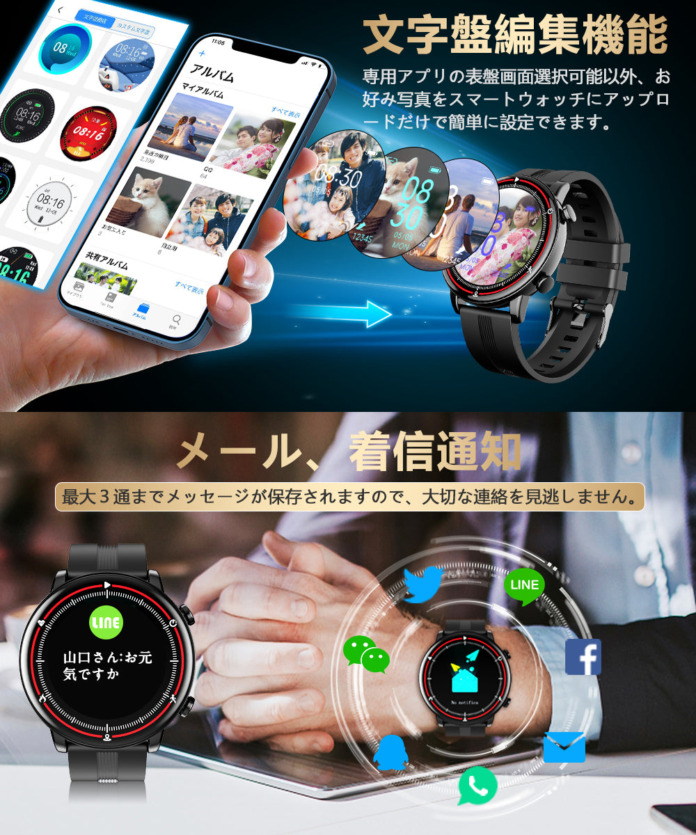 💗【着信通知&文字盤自由設定】スマートウォッチとスマホがペアリングし、電話着信、メッセージ通知、Lineなどの通知は振動でお知らせします。電話番号、お名前、メッセージ、対応するSNSのアイコンも表示されます。また、メッセージ通知は最新の3件の記録を保存できます。専用アプリの表盤画面選択以外、お好み写真をスマートウォッチにアップロードだけで画像をディスプレイにする事も出来ます。お好みに合わせて、専用の画面を選べます。
