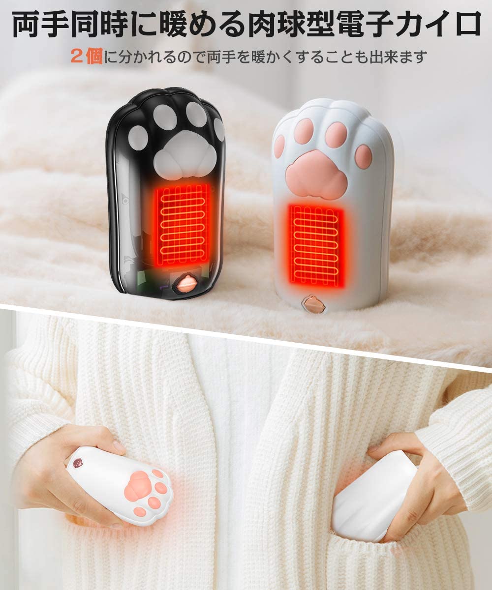 可愛い肉球型の充電式カイロです。電気カイロは2個に分かれるので両手で持ち温めることができます。配線コードは最大75cmまで伸びます。また、もとに戻す場合は片方を優しくひっぱりますと自動的に巻き戻ります。