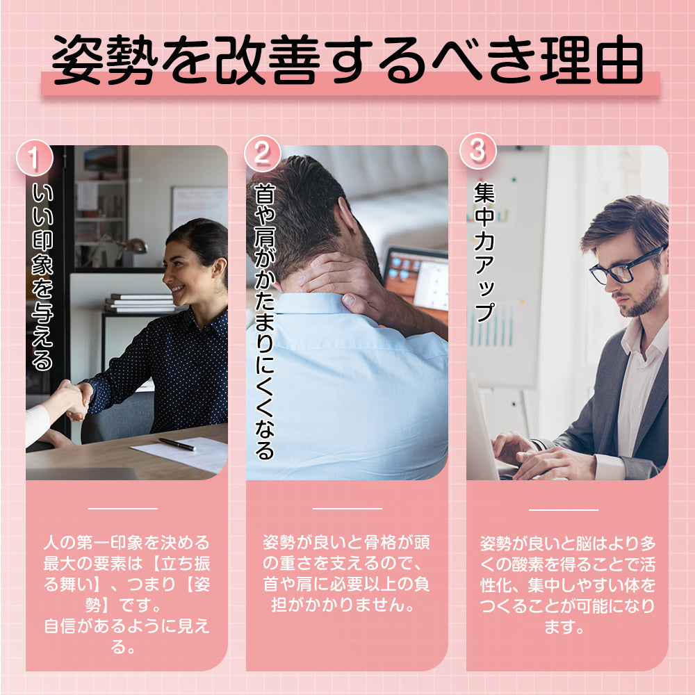 ですが、姿勢が良いと見た目の印象が良くなり、若く見えると言われています。背筋を無理なく伸ばし、美しい姿勢をサポートします。