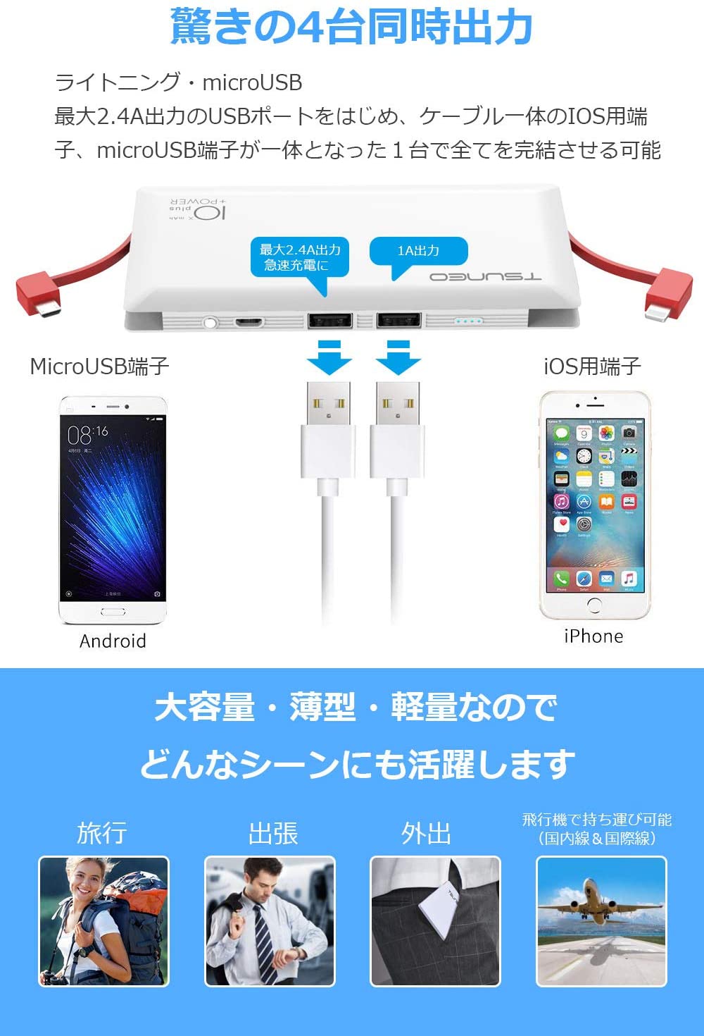 コンパクトで大容量:大容量の10000mAhで、iPhone6s に約4回、iPhone7 Plus に3回、Galaxy S6に2.5回、 iPad Mini