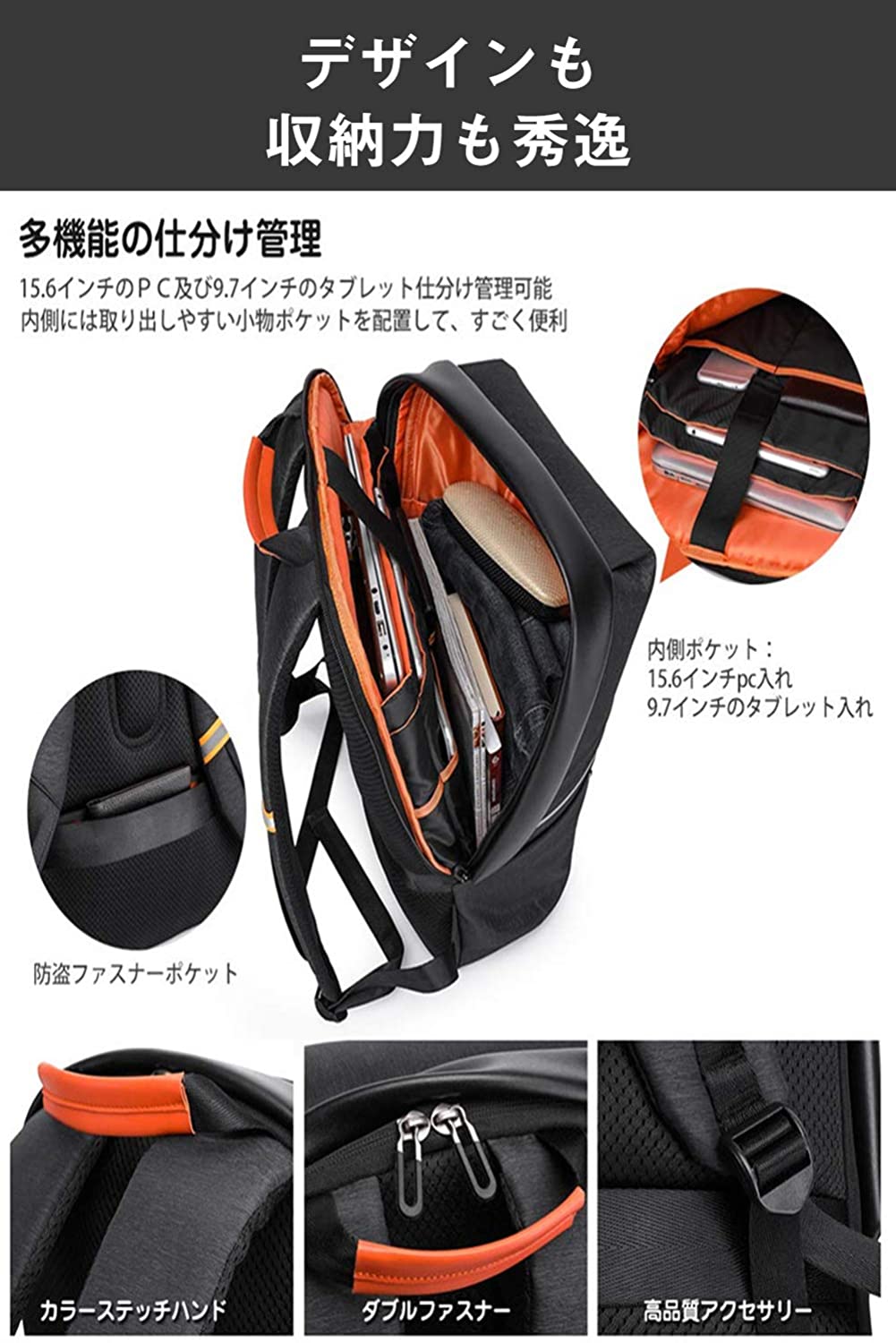 【収納力&耐傷付き】リュックの収納ポケットが充実してるので15.6インチのパソコン、タブレット、携帯電話、メモ帳など分けてしっかり整理整頓でき、外出先でのイライラともお別れです。独立したパソコン・タブレット用ホルダーは全体的にクッションで覆う仕様になっている為、従来のリュックサックモデルよりも衝撃緩和対策と安定感があります。引っ張りや摩擦に強い、伸び縮みがなく、型崩れしない高品質ビジネスリュックです。